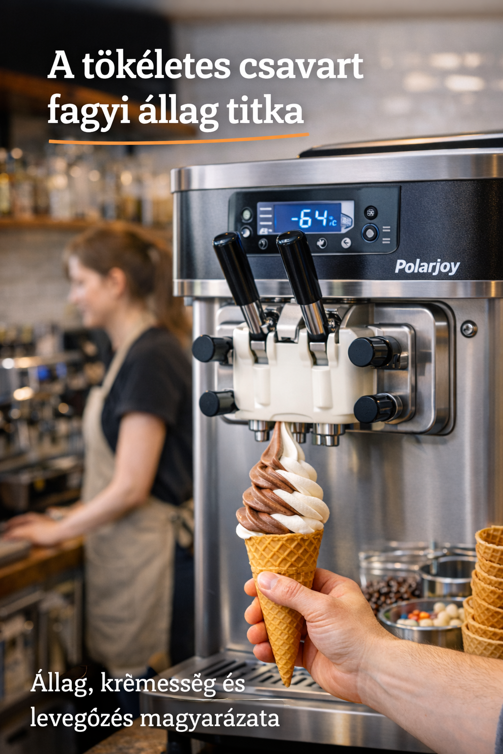 A csavart fagyinál az állag egy nagyon kényes egyensúly. Ha a fagyi túl meleg, könnyen elpuhul, folyósabb lesz, és a csavar nem tartja szépen a formáját. Ha túl hideg, keményedhet, törhet, vagy akár szemcsésebb érzetet is kelthet. Emiatt kulcskérdés, hogy a fagyi mindig az "ideális zónában" maradjon, mert ettől lesz egyszerre krémes és stabil.