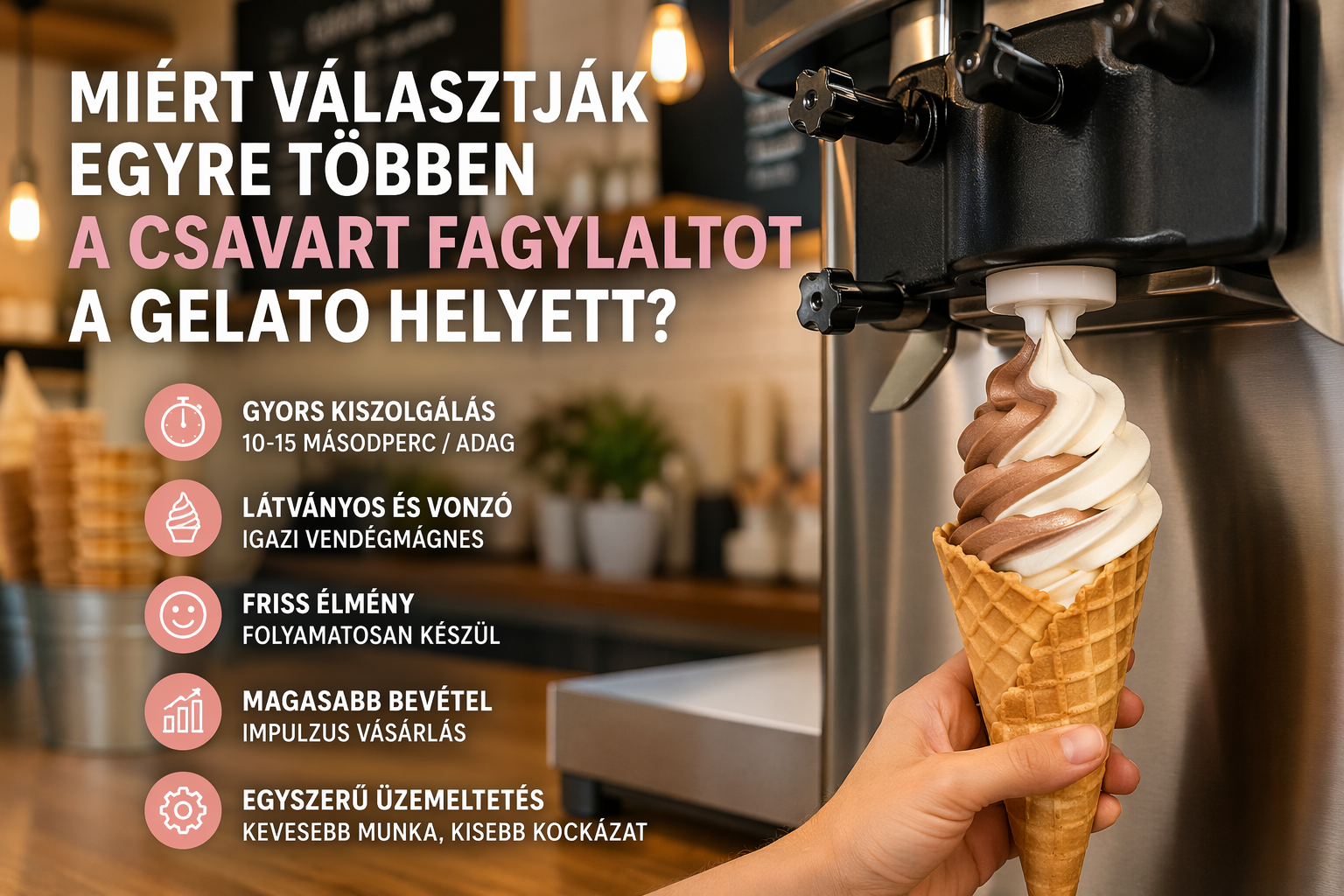 A csavart fagyinál az állag egy nagyon kényes egyensúly. Ha a fagyi túl meleg, könnyen elpuhul, folyósabb lesz, és a csavar nem tartja szépen a formáját. Ha túl hideg, keményedhet, törhet, vagy akár szemcsésebb érzetet is kelthet. Emiatt kulcskérdés, hogy a fagyi mindig az "ideális zónában" maradjon, mert ettől lesz egyszerre krémes és stabil.
